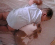 チビが手を伸ばしたらすかさず、頭をのっけてきました。