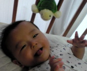 水族館で買ったカメ君。ふわふわしてるし、ピヨピヨ鳴るし、チビのお気に入りです♪丸顔がそっくり☆