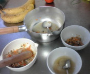 人参とナス、ササミをみじん切りにして、野菜スープで煮て。みじん切りがうまくいかないので、最終的にはすりこぎにも頼りながら…。