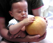 1.5㎏ メガネが「どーしても梨狩りがしたい!」と言うので、溝辺の農園へ。 梨の木の高さが低めで、腰をかがめながらの狩りに、大人2人は「腰が〜!」と言いながら、探すこと数十分…。 大きな梨を5個も狩りました。何と合計6㎏!一番大きい梨は、1.5㎏もありました☆ チビの頭くらいかな?と思ったのですが、写真の通り…です。 « 前の記事 次の記事 » コメント(0)