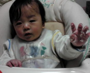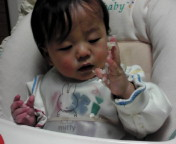 ベチャベチャにして、口に運ばず、泣く。ベタベタが嫌だったようで、ご飯中機嫌が悪くなる。いつも通り、カカがスプーンで食べさせる。